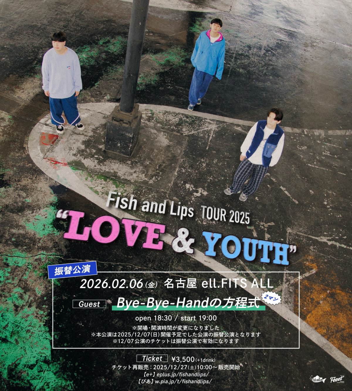 本公演は、12/7(土)に開催予定でした Fish and Lips TOUR 2025 “LOVE & YOUTH” (名古屋編) の振替公演です。