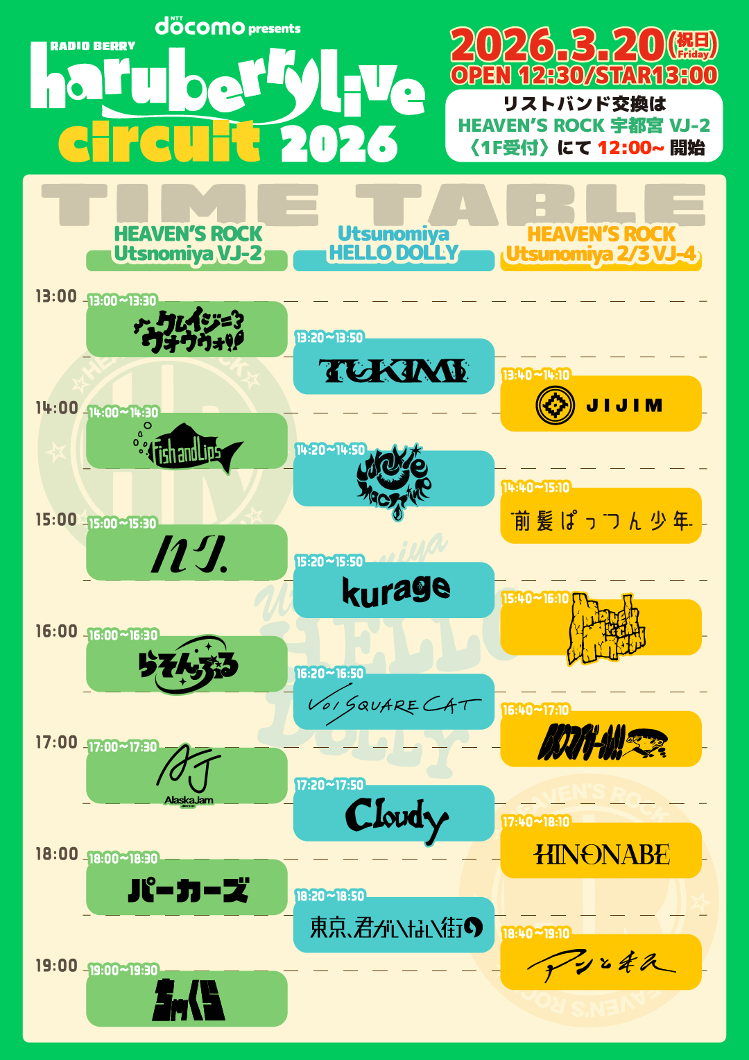 12:30 OPEN / 13:00 START ※リストバンド交換 12:00開始 -