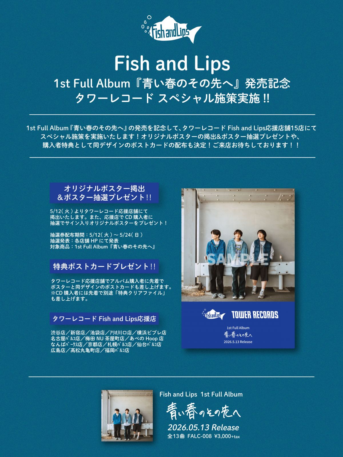 Fish and Lipsの1st Full Album 『青い春のその先へ』の発売を記念して、タワーレコード Fish and Lips応援店舗15店にてスペシャル施策を実施いたします!オリジナルポスターの掲出&ポスター抽選プレゼントや、購入者特典として同デザインのポストカードの配布も決定!ご来店お待ちしております!!